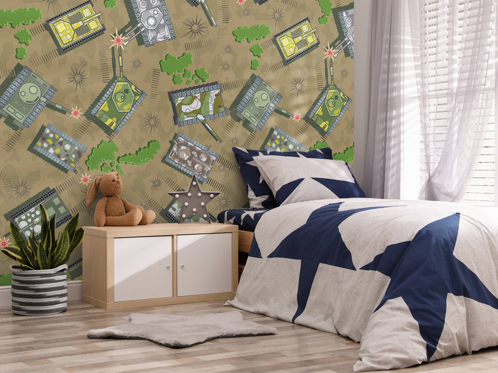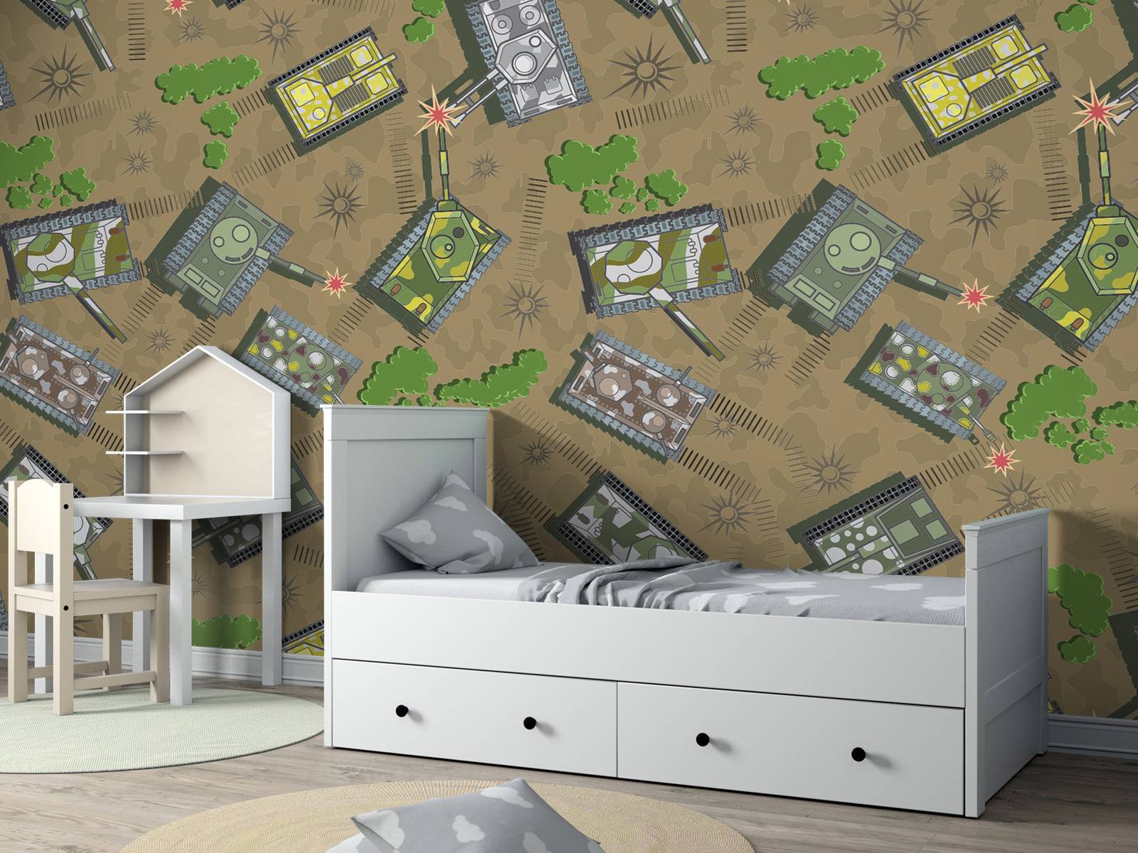 Photo wallpaper with a pattern of army green tanks on a sandy plain