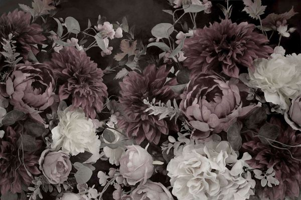 A lush and romantic floral decor with deep burgundy peonies and soft, ivory roses against a mysterious dark background. The muted leaves and subtle shadows give the whole a vintage look, perfect for an elegant and atmospheric interior.
