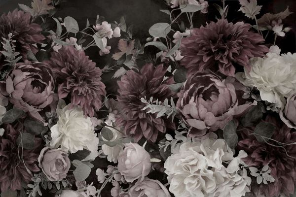 A rich and mysterious floral design featuring lush dahlias and roses in deep purple and cream colors. The dark background enhances the dramatic effect, while the interplay of leaves and petals evokes a luxurious and serene atmosphere. A timeless choice with a touch of elegance.