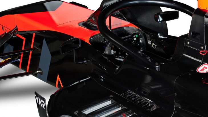 Gedetailleerd fotobehang van een Formula 3 raceauto waarbij zowel de zijkant als achterzijde goed in beeld is. Ongekende details zoals de ventilatieroosters en de achterspoiler uitgevoerd in carbon.