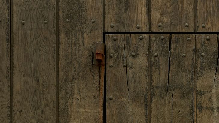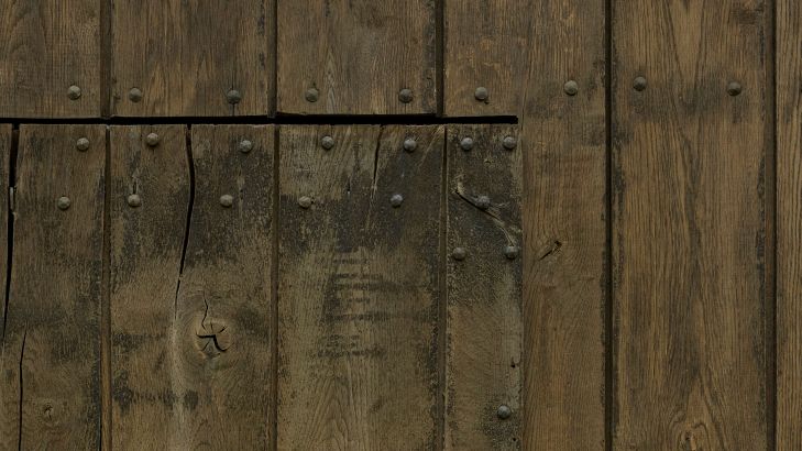 Wooden wall with door. With this wallpaper in your home, it is as if you can walk through the door yourself.