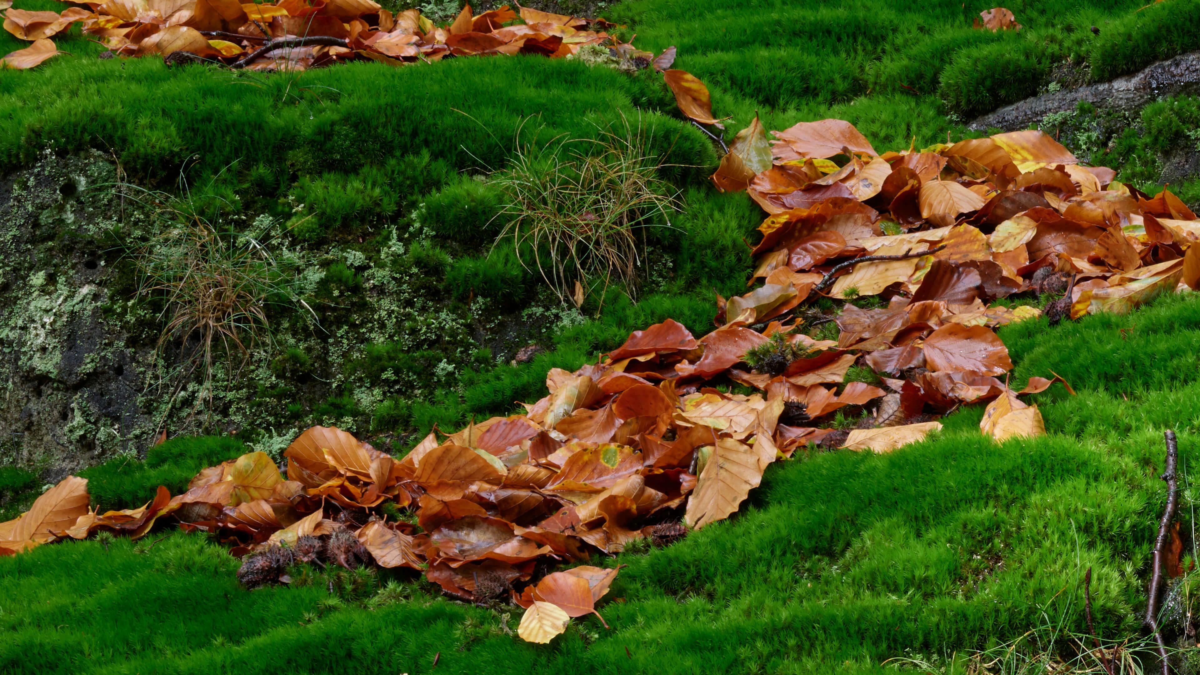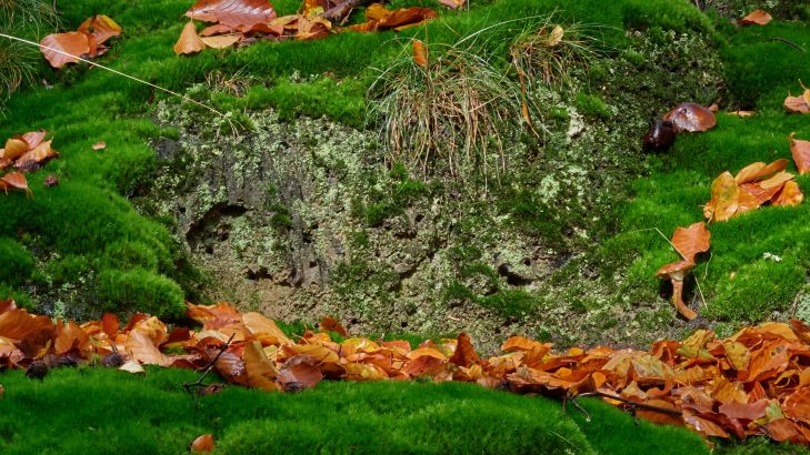Mos met herfstbladeren en paddestoelen na een regenbui
