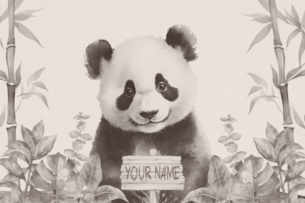 Surrounded by the rustling bamboo, a panda cub rests with a look full of tender curiosity. Its soft, downy contours contrast subtly with the clean lines of the surrounding leaves, creating a peaceful natural harmony.
