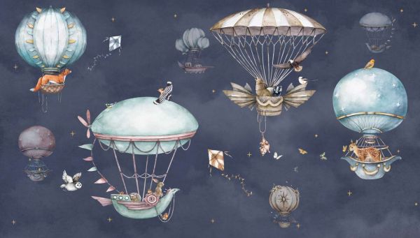 In this enchanting night landscape, forest animals float through a starry sky in elegant hot air balloons. Each animal – from fox to rabbit and bird – has its own unique balloon, ranging from classic shapes to imaginative designs like a flying owl or a ship-shaped basket. Kites playfully dance among the balloons, while white doves and owls glide through the air. The background consists of a deep blue sky with subtle cloud structures and twinkling stars, giving the whole scene a dreamy and calming appearance. The colors are rich and harmonious: midnight blue, jade green, soft pink, golden brown, and cream. These colors create a warm, cozy atmosphere that is ideal for a bedroom or nursery. The design perfectly complements interiors with soft fabrics, wooden accents, and lighting in the shape of stars, moons, or nightlights. This design is perfect for children who love dreaming, animals, and the universe. It stimulates the imagination while also providing calmness for bedtime. Perfect as a focal point on a wall, but also as part of a broader space or night theme with matching accessories such as bedding with moon patterns, soft cloud pillows, and books about space or animals. The illustration is both detailed and balanced: there is much to discover, but the calm composition makes the whole scene soothing. Each element is carefully placed and radiates adventure and security at the same time – as if the animals are together on their way to a distant, peaceful dream world.