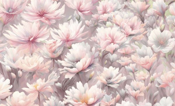 A romantic and refined floral decor with soft pastel-colored blossoms in shades of powder pink, cream, and light lilac. The subtle brushstrokes and dreamy background create a light, serene, and elegant appearance, perfect for a calming interior.