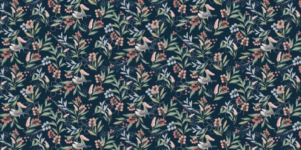 An atmospheric composition where lively tits nestle among green-tinted leaves and a multitude of berries. The design plays with contrasts, with the midnight blue background enhancing the color palette of spicy pink tones and soft green nuances. The tits bring life and movement to the scene, while the berries and flowers suggest a sense of abundance and fertility. This design is a celebration of the natural world in an elegant guise.