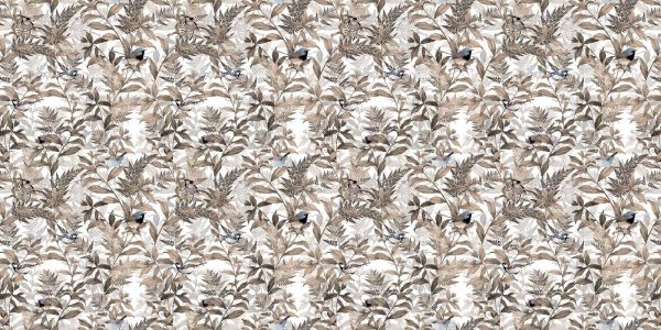 Among the muted tones of autumn leaves, delicate birds playfully hide, creating a soothing scene. The natural colors and soft shades form a rustic pattern that captures the essence of a peaceful autumn day in the forest.