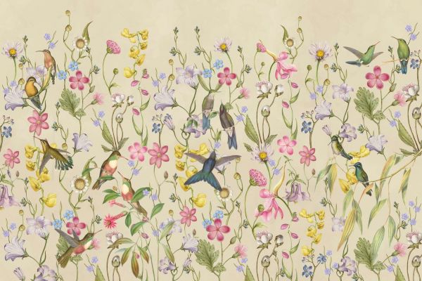 This refined design combines the beauty of blooming roses with the vibrancy of hummingbirds, together creating a harmonious and serene scene. The soft pastel colors of the flowers are subtly contrasted by green leaves and a neutral background, evoking a sense of elegance and tranquility. The design fits perfectly in a classic or romantic interior, where it serves as a subtle focal point. For a more rustic style, it can be excellently combined with wooden furniture and light, natural fabrics such as linen or cotton. Ideal for use in bedrooms, living rooms, or even a stylish reading nook, where it brings an inviting and relaxing atmosphere. The combination of flowers and birds invites dreaming and creates a timeless elegance in any space.