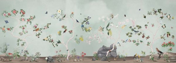 This design brings to life an enchanting atmosphere, in which flora and fauna are masterfully brought together. Subtle colors and fine details form a harmonious landscape that radiates the serenity of nature. Blooming flowers, elegantly flying birds and lovely butterflies create a lively scene that radiates both dynamism and tranquility. The soft pastel shades and organic shapes fit perfectly into various interior styles, from a modern Scandinavian setting to a classic or romantic atmosphere.
