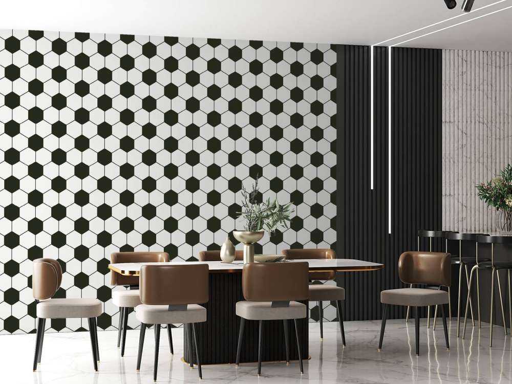 Wallpaper with a black and white tile pattern with geometric polygons. With a little imagination, you could recognize a football in it.