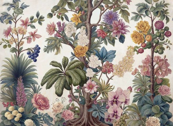 This image shows a lush botanical composition with a graceful tree at the center, surrounded by an abundance of flowers, blossoms, leaves and fruits. The illustrative style is reminiscent of classic botanical prints, with much attention to detail, texture and natural forms. Flowers in soft pink, powder lilac, warm yellow and cream are alternated with rich green and blue-green foliage, creating a harmonious and balanced appearance. The light, almost linen-like background provides a calm base and allows the colors to subtly glow. This results in a refined and timeless atmosphere that fits perfectly within a classic or country interior. In combination with wooden furniture, warm fabrics and natural materials such as linen and ceramics, this image is particularly beautiful and enhances the homely and elegant look of the space. Also within a botanical or romantic interior, this design is a strong mood-maker. The rich variation of flowers and leaves pairs beautifully with interiors where nature and decoration come together. Think of combinations with plants, soft pastel tones, vintage accessories and organic shapes. The tree structure provides calm and coherence, while the flowers add playfulness and detail. This design is very suitable for spaces where character and refinement are desired, such as a living room, dining room or stylish hall. In a living room it serves as an artistic centerpiece, while in a dining area it creates a warm and inviting atmosphere. The combination of botanical richness, soft colors and classical illustration style makes this image timeless, decorative and widely applicable within diverse interior styles.