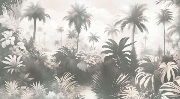 This tropical landscape in warm earth tones exudes a refined and soothing atmosphere. The graceful palm trees and lush tropical vegetation are enveloped in a soft mist, creating a dreamy and nostalgic ambiance. The colors range from subtle browns and warm cream tones to soft green nuances, resulting in a timeless and elegant whole. Thanks to the neutral and earthy tones, this design fits perfectly into a classic or bohemian interior. In a classic setting, it can be combined with dark woods, leather furniture, and vintage accessories to create a chic and luxurious look. For a bohemian vibe, it works well with rattan, linen, and natural fabrics, creating a warm and inviting appearance. This design also beautifully complements a rustic or botanical style. In a rustic interior, it can harmoniously blend with robust wooden furniture, handmade decorations, and soft earthy colors. For a botanical effect, it can be enhanced with houseplants and light natural materials, further emphasizing the jungle feel. This design is perfect for living rooms, bedrooms, and relaxation spaces, where it creates a calming and stylish atmosphere. The combination of exotic richness and vintage color nuances makes this design a unique and versatile choice for lovers of a warm, atmospheric, and elegant decor.