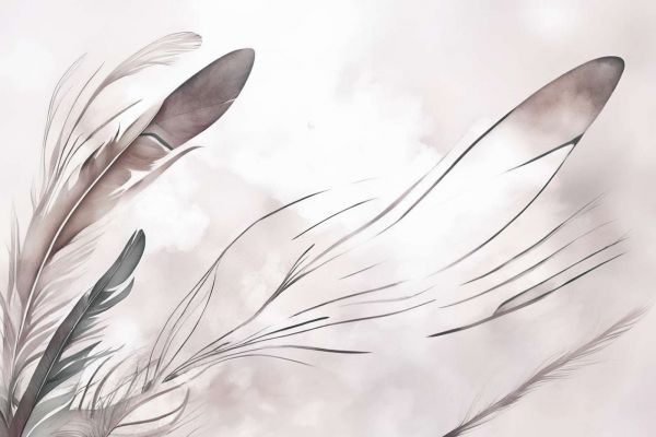 A serene design of flowing, brown-tinted feathers against a cloudy, warm background. The subtle movement and soft transitions create a sense of lightness and tranquility.