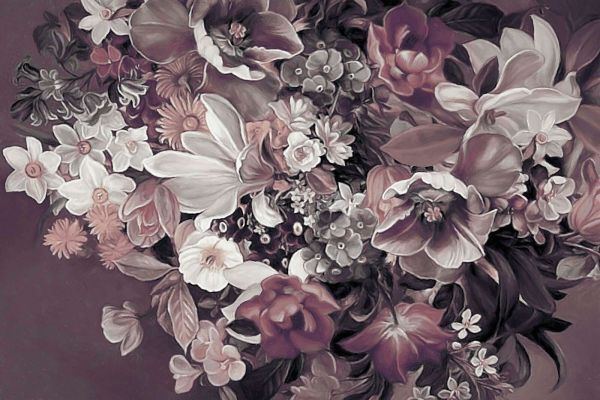 This enchanting floral design combines warm, nostalgic tones with a classic, picturesque appearance. The soft colors of old pink, cream, and plum purple are harmoniously blended with subtle gray-green accents, creating a soothing and refined whole. The dark background makes the flowers stand out even more and adds a touch of depth and mystery. Thanks to the warm and romantic color palette, this design is ideal for a classic or vintage interior. It beautifully complements wooden furniture in natural or white tones, elegant accessories in brass or copper, and soft fabrics like velvet and linen. For a modern interior, this design can create a refined contrast when combined with clean lines and neutral colors like taupe or anthracite. The harmonious and soft shades make this design perfect for atmospheric spaces such as the bedroom, living room, or a chic dining room. The deep, warm colors create a cozy and inviting ambiance, while the floral motifs add a romantic and timeless touch. For an extra refined look, accessories in gold or bronze tones can enhance the luxurious and vintage atmosphere. This timeless floral design brings a sense of elegance and warmth to any interior and forms a stylish foundation for a cozy and tasteful space.