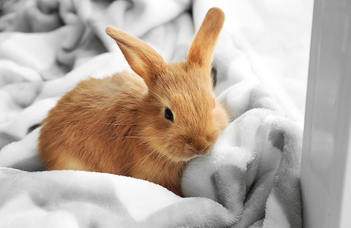 A cute little brown rabbit lying on a blanket.