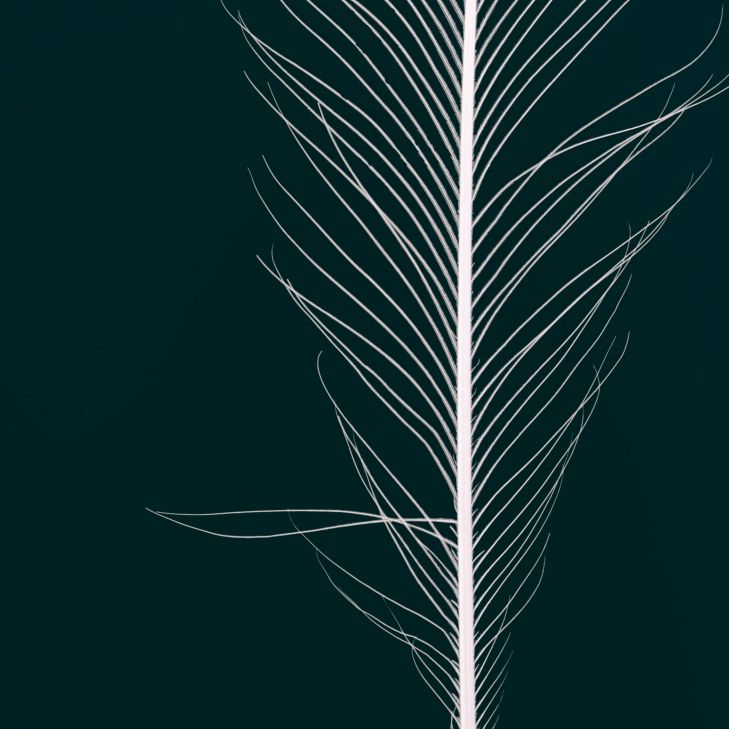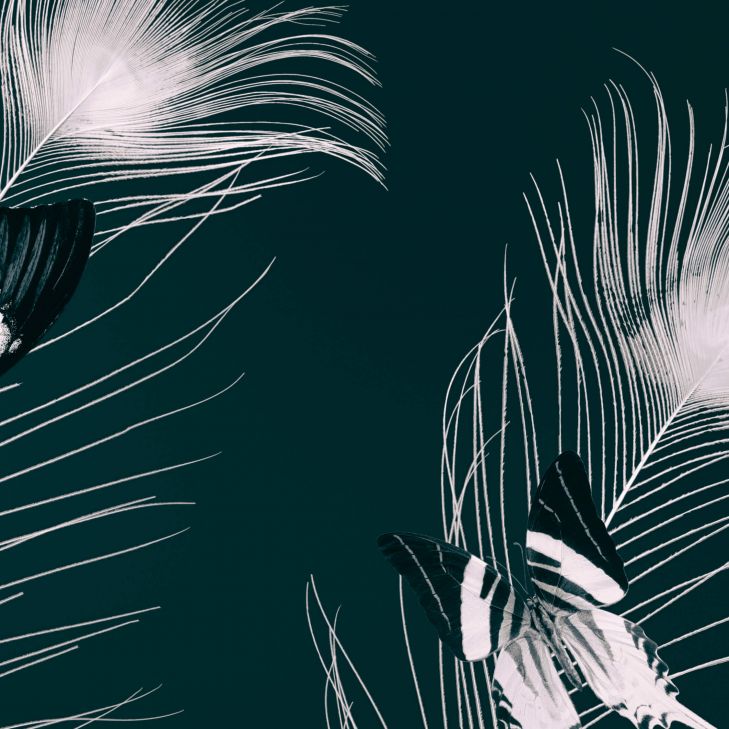 An artistic combination of white peacock feathers and butterfly in front of a blue background.