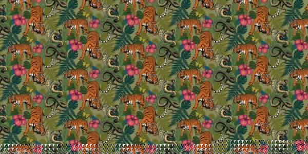 Pattern of cobras and tigers with flowers, leaves and butterflies on a green background.