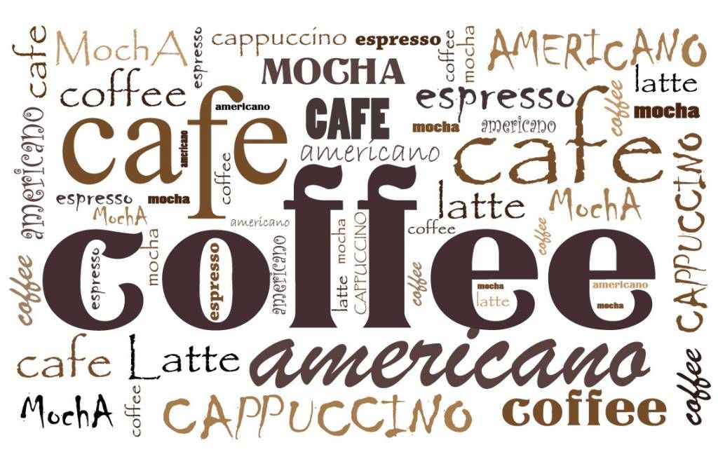 Photo wallpaper with different types of coffee variants in different fonts and sizes