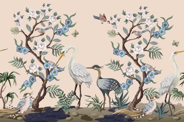 Colourful herons near blossom trees. Combine this photo wallpaper in your children's room and create a cheerful atmosphere.