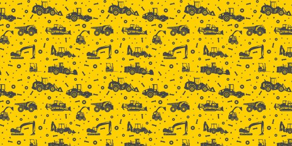 Yellow wallpaper with different types of construction traffic, such as a crane, a shovel, and a dump truck. Between the vehicles, bolts, screws, and gears are floating.