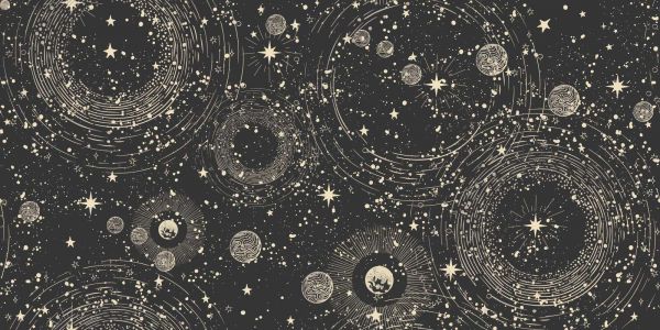 A captivating starry sky filled with spiral-shaped star clusters, planets and star trails in soft cream on black. The design radiates mystique, movement and spatial depth.