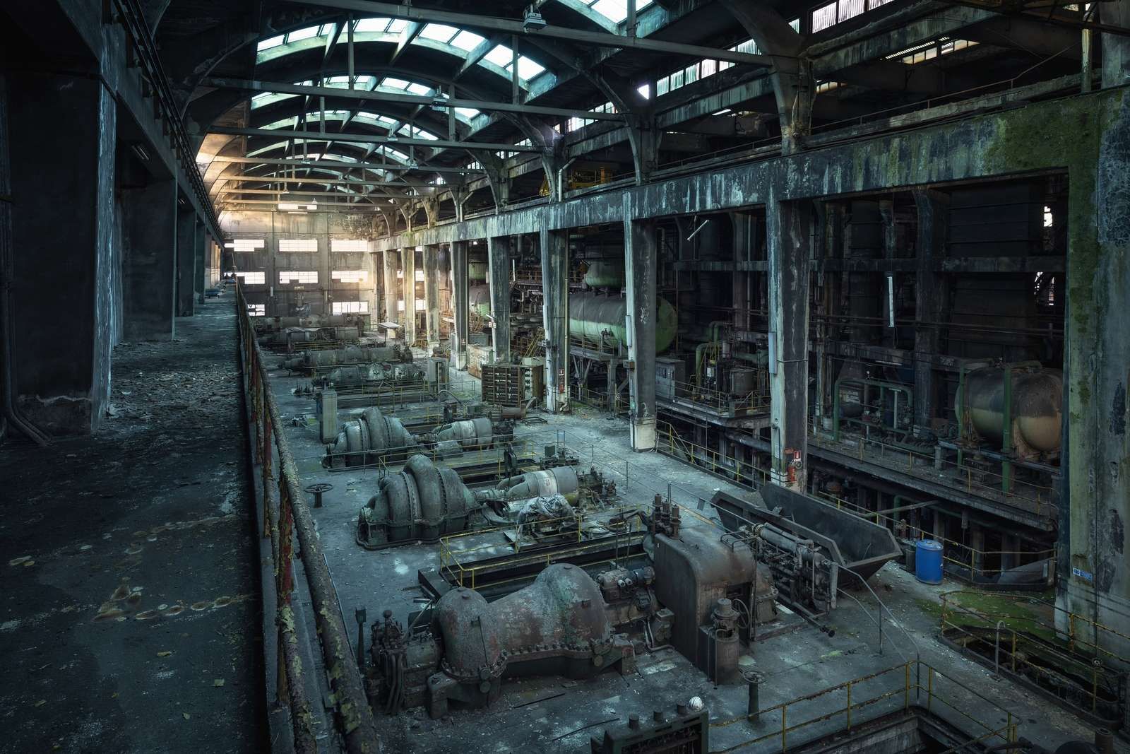 An abandoned gas plant that used to power a huge steel mill. All the turbines are still present in the huge hall. The blue glazed ceiling creates an incredible play of colors inside. One of the most beautiful industrial monuments in Italy.