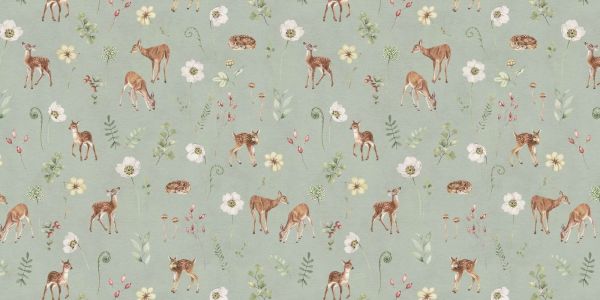 A delicate forest pattern with graceful deer and subtle flowers in soft pastel colors. This playful design exudes a lovely and natural atmosphere, perfect for adding a soft and charming accent to any space.