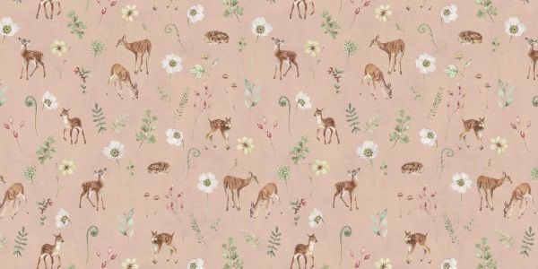A delicate forest pattern with graceful deer and subtle flowers in soft pastel colors. This playful design exudes a lovely and natural atmosphere, perfect for adding a soft and charming accent to any space.