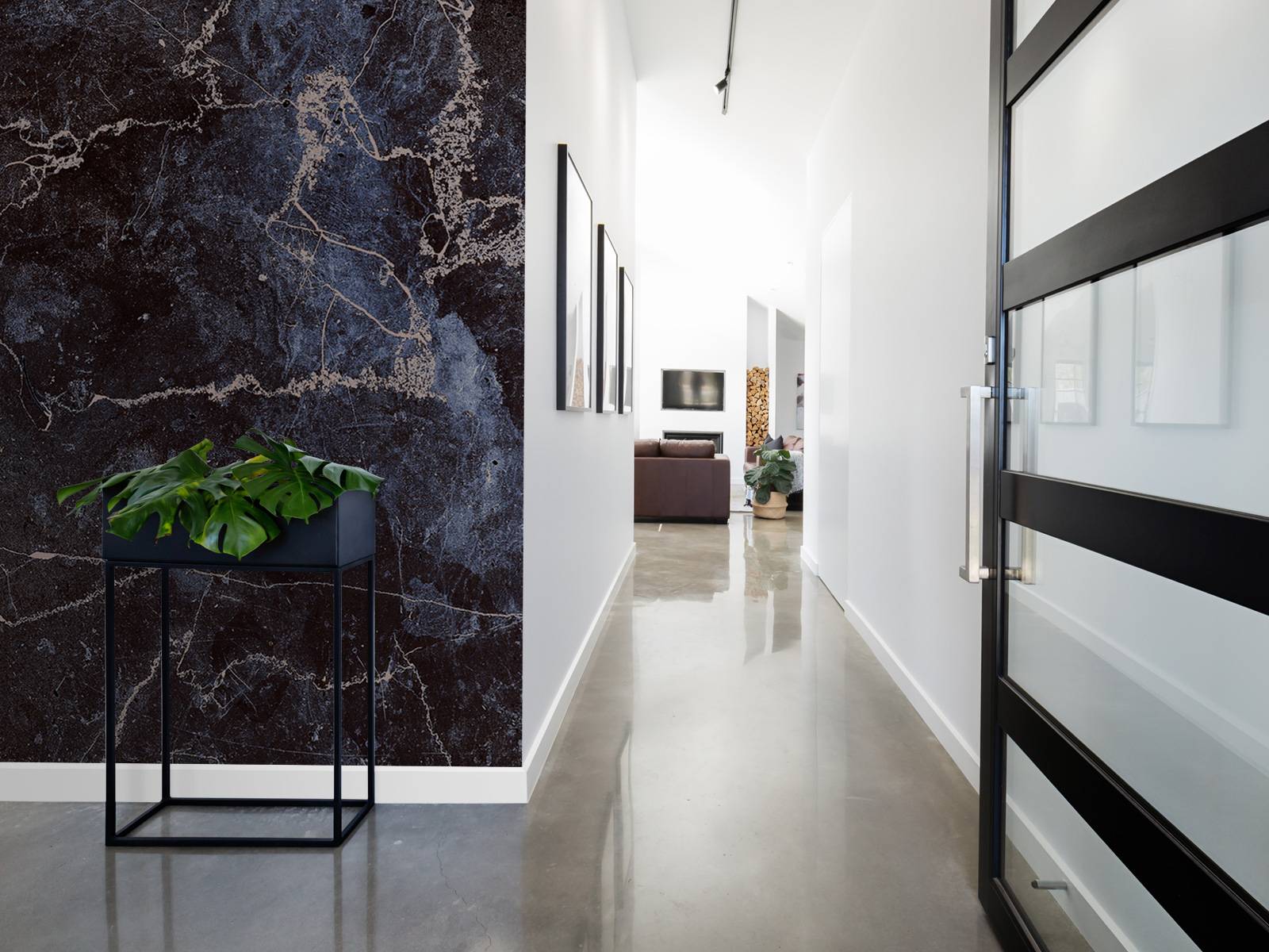 Dark marble on photo wallpaper. The dark marble colour creates a chic atmosphere in your home.