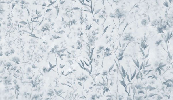 A refreshing floral pattern in soft shades of blue, with subtle green and white nuances. The lightly watercolor-like strokes create a calm and serene atmosphere.
