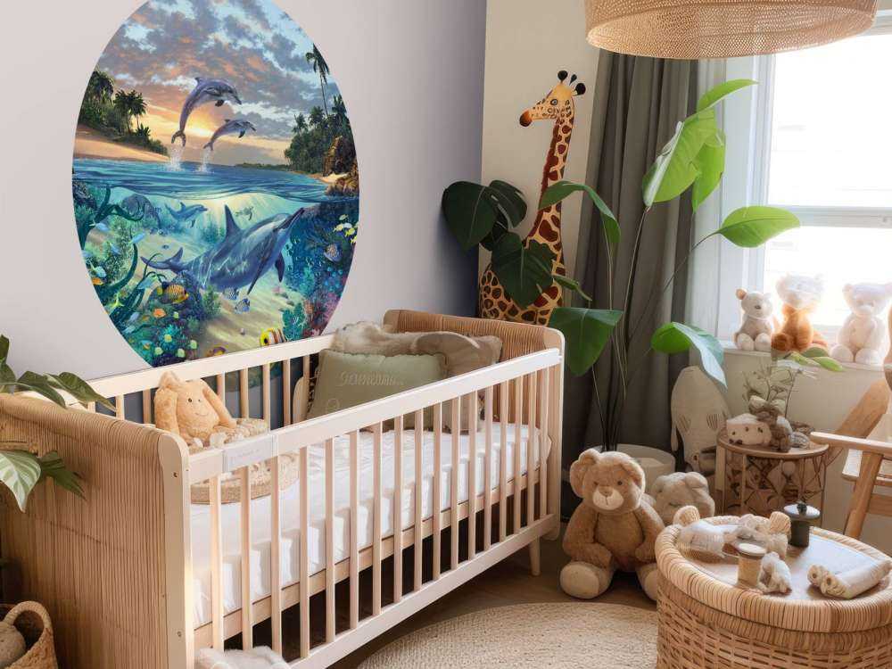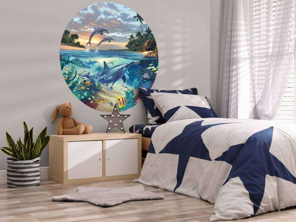 This beautiful design brings together the tranquility and magic of a tropical coastline with the vibrant beauty of underwater life. Above the water, graceful dolphins glide through the air, their leaps illuminated by the warm glow of a sunset. The background features an idyllic beach, lined with swaying palm trees and rocky shores, creating a serene and exotic atmosphere. Below the water's surface unfolds a rich and colorful ecosystem. The reef is teeming with life, featuring exotic fish in shades of yellow, orange, purple, and blue, and lush corals in pink, red, and green. The clarity of the water reveals the depth and diversity of the ocean, with even more dolphins gracefully swimming in their natural habitat. This design is perfect for modern, tropical, or maritime-inspired interiors. In a bathroom or wellness space, it creates a relaxed and soothing atmosphere, while in a children's room, it adds a sense of adventure and discovery. Combine with decor in earthy and blue tones to fully embrace the tropical theme. The combination of the serene coastline and the dynamic underwater world makes this design a visual spectacle that celebrates the beauty and diversity of nature. It brings a sense of relaxation and wonder to any space where it is applied.