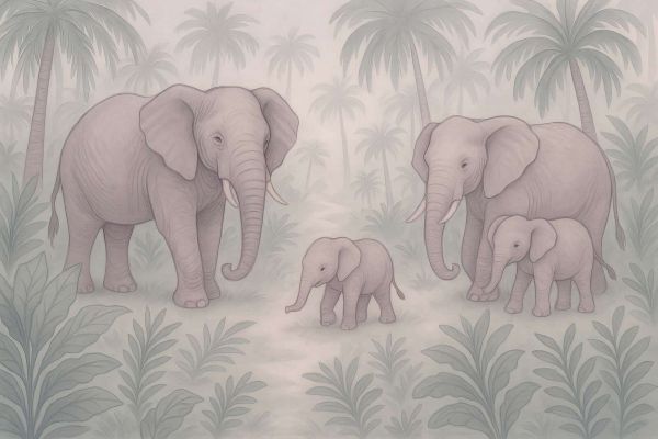 This tender jungle scene shows a harmonious elephant family in the midst of a soft, tropical environment. Two adult elephants and three playful little ones walk calmly along a path surrounded by graceful leaves and tall palm trees. Everything is enveloped in a light mist that gives the whole scene a dreamy and calm atmosphere, as if you are looking at an early morning in the jungle. The color palette consists mainly of muted pink tones, soft lilac, and grayish-green. These subtle and cool colors create peace and balance in the space, without bright accents or busy patterns. The soft lines and refined shadows add depth to the image, while the friendly posture of the elephants provides a sense of safety and security. This design fits beautifully within serene interior styles such as Scandinavian or Japandi, where natural elements and tranquility are central. Combine it with light wood types like ash or beech, linen curtains in white or grayish-green, and accessories in earthy colors like taupe, sand, and pastel green. Cuddly toys made of natural fabrics and a wooden toy elephant can subtly enhance the theme. Particularly suitable for baby rooms, but also for toddler rooms that need a calm, soft base. Use it as a background for a crib, changing area, or play corner. The presence of the elephant family exudes care and connection, making this design not only decorative but also imbued with a sense of warmth and love.