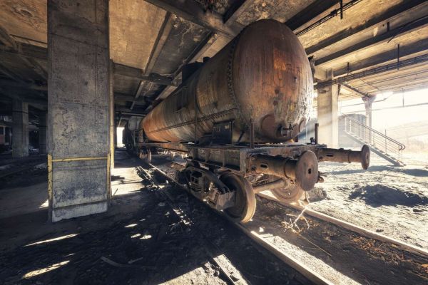 This rusty freight train stands along with old Passgagier wagons on the siding in an old train depot in France.