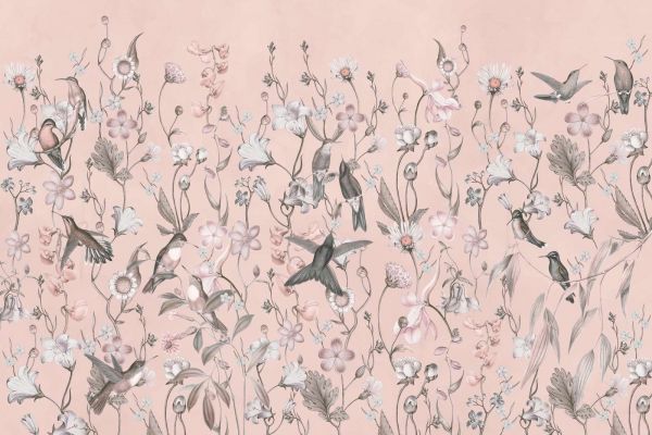 A vibrant design with delicate flowers and graceful hummingbirds, harmoniously woven into a light composition. This pattern exudes a refined natural charm and brings a fresh, spring-like atmosphere to any space.
