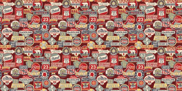 Wallpaper with an all-over print of American billboards and traffic signs in red and cream tones.