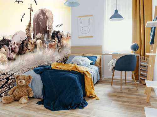 Wallpaper of a group of African animals. Create more atmosphere in the nursery with this wallpaper.
