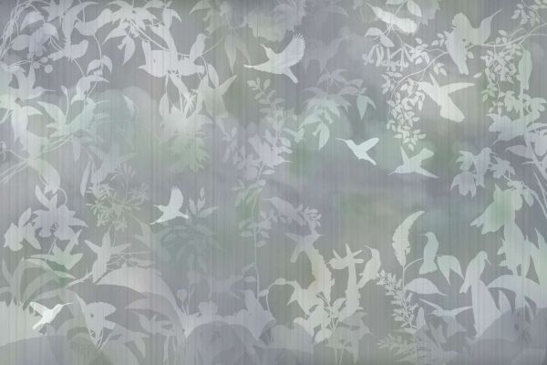 This serene design combines the elegant shapes of birds in flight with a subtle misty background. The soft pastel shades of blue, green and gray flow together harmoniously and give the design a calming appearance. The play of light and shadow, with silhouettes of hummingbirds and leaves, creates a sense of depth and mystery.