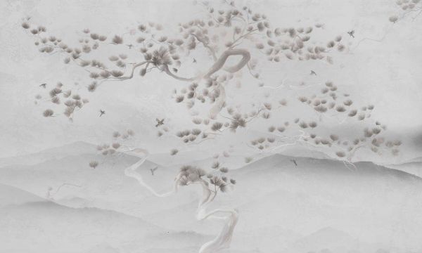 This serene illustration captures the essence of silence and elegance in a single image. A graceful tree with flowing branches spreads out against a background of soft gray tones and misty textures. The leaves – fine as brush strokes – seem to float in the air, while small birds bring tranquility to the whole. The composition is reminiscent of traditional East Asian ink art, with its subdued color palette and refined balance between emptiness and detail. The color scheme consists of a harmony of silver gray, light anthracite, and white nuances. These neutral tones make this design exceptionally suitable for minimalist, Japandi, or modern interiors. Think of a decor with light wooden accents, black details, smooth surfaces, and natural materials such as linen, bamboo, and ceramics. The image radiates a calmness that perfectly fits spaces where peace and simplicity are desired: a bedroom, meditation room, work corner, or entrance. The fine lines and open composition create an airy atmosphere, while the subtle movement in the branches and birds adds a gentle rhythm to the space. Due to its neutral color scheme, this design is easy to combine with various living styles and color accents. Whether you are looking for a calm, monochrome base or a stylish decorative element that does not overpower – this illustration offers a timeless and refined visual anchor.