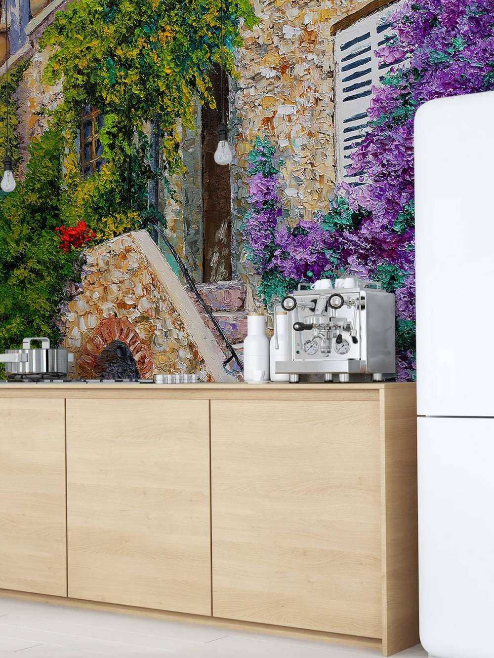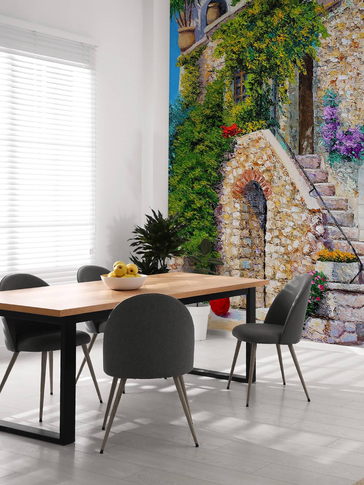 This image shows a picturesque stone house with an elegantly constructed staircase and a lush display of flowers that adorns the surroundings. The use of natural textures and colors gives a sense of timeless beauty. Ideal for classic or country interiors, this image brings a feeling of authenticity and warmth to a space. Combine with earthy tones and antique-looking accessories for a harmonious effect.