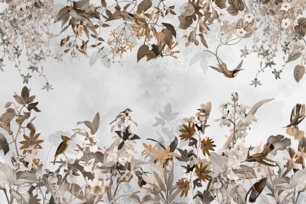 This beautiful design combines natural elements such as blooming flowers, graceful birds and a soft background to create a serene and enchanting atmosphere. A harmonious whole is created with a palette of pastel and natural shades, such as soft green, light pink and subtle earth tones. The details of fluttering birds and botanical motifs add a dynamic yet understated feel. Ideal for a living room or bedroom where peace and elegance are desired, or to give a unique look to an office space. Combine this design with neutral furniture and accessories, such as wooden accents or linen fabrics, to accentuate the natural elements. This timeless composition is suitable for both modern and classic interiors.