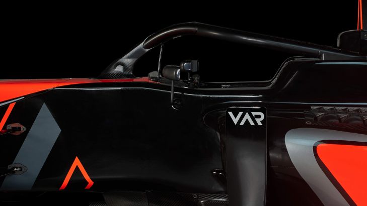 Side view of a modern Formula 3 racing car with black background. The picture was taken from a low angle and is captured in unprecedented high quality with fantastic details of the spoilers and cockpit.