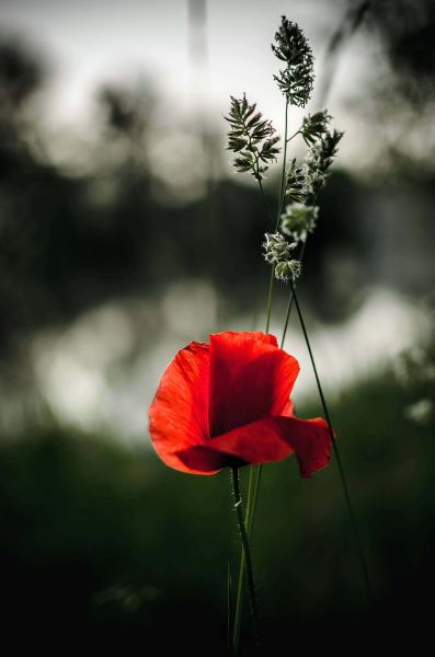 Red poppy with a blade of grass in the field. A sharp close-up of a poppy with an out of focus background.