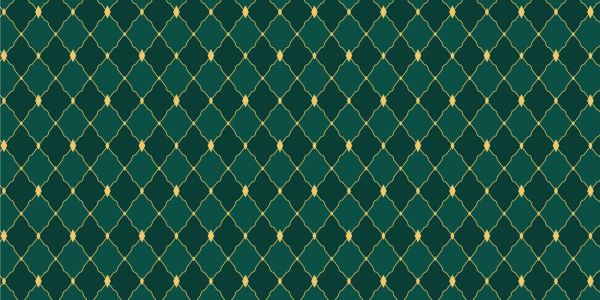 Green wallpaper with a diamond pattern in two shades of green with yellow lines.