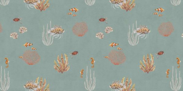 A calming underwater pattern with colorful coral reefs, tropical fish, seahorses, and turtles. The soft brown background and detailed illustrations create a serene maritime atmosphere, perfect for adding a relaxed and exotic touch to any space.