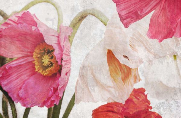 Softly colored poppies in pink, red, and powder white gracefully bend with their stems against a lightly weathered, cream-colored background. An airy and dreamy image full of movement and romance.