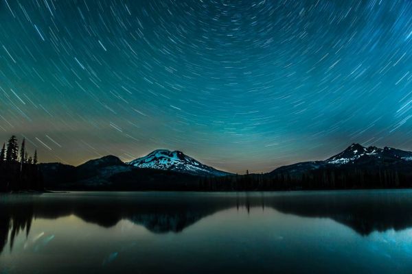 Wandkleed met een donkere sterrenhemel met een rond effect en een besneeuwde berg. Op de voorgrond is een meer zichtbaar waarin het geheel weerspiegelt
