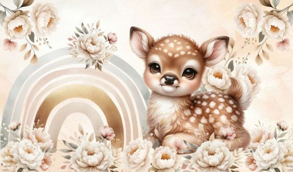 This enchanting design brings the charm of nature indoors with a cute fawn sitting among lush flowers. The fawn's large, sweet eyes and soft fur radiate a sense of calm and innocence. Behind the fawn, a stylish rainbow sparkles in warm beige and cream tones, finished with subtle golden accents that add a touch of elegance. The soft, neutral colors and delicate floral details make this design perfect for a children's room, nursery, or a space where a calm, dreamy atmosphere is desired. In a bohemian or Scandinavian interior, it beautifully complements light woods, soft fabrics, and natural materials like linen and rattan. Do you want to create a romantic and warm look? Then combine this design with pastel and earth tones, soft throws, and decorative accessories like dried flowers or golden details. For a playful touch, cute plush animals and wooden furniture can contribute to the cozy atmosphere. This design radiates warmth, love, and security and is perfect for little and big dreamers. The combination of the cute fawn, the dreamy rainbow, and the graceful flowers makes this a timeless and enchanting scene for any space.