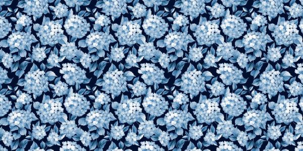 This design features a collection of hydrangea flowers, illustrated in various shades of blue that elegantly contrast with a deep night-blue background. The flowers are stylised with delicate shading, creating a depth that makes the blossoms almost jump off the canvas.