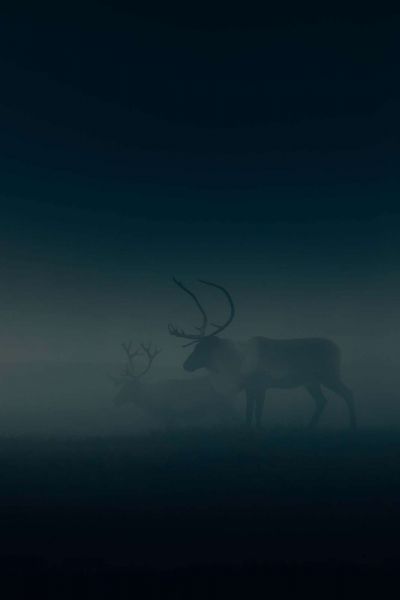 This image radiates a calm and mysterious atmosphere, where two noble deer slowly emerge from a thick veil of mist. The misty surroundings and the soft color gradient from midnight blue to gray-green create a dreamy, almost cinematic appearance. The animals are subtly visible, with elegant silhouettes that evoke a sense of silence and timelessness.