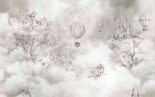 A fairy-tale scene in soft silver and gray tones, with flying dragons, dream castles, and hot air balloons among floating clouds. A unicorn, flowers, and an elegant carriage complete the picture and make it enchanting.